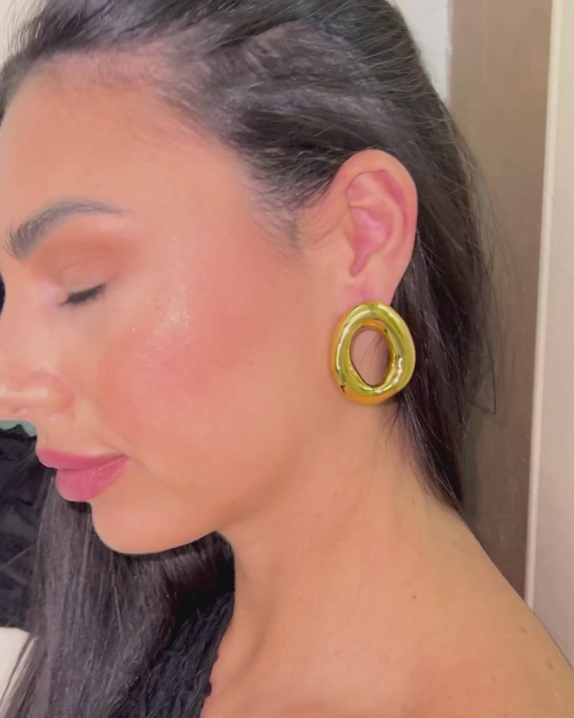 Orecchini dal design moderno e raffinato, caratterizzati da una forma ovale lucida e una finitura dorata che cattura la luce con eleganza. Perfetti per aggiungere un tocco sofisticato e deciso ad ogni look, dai più casual agli outfit serali.